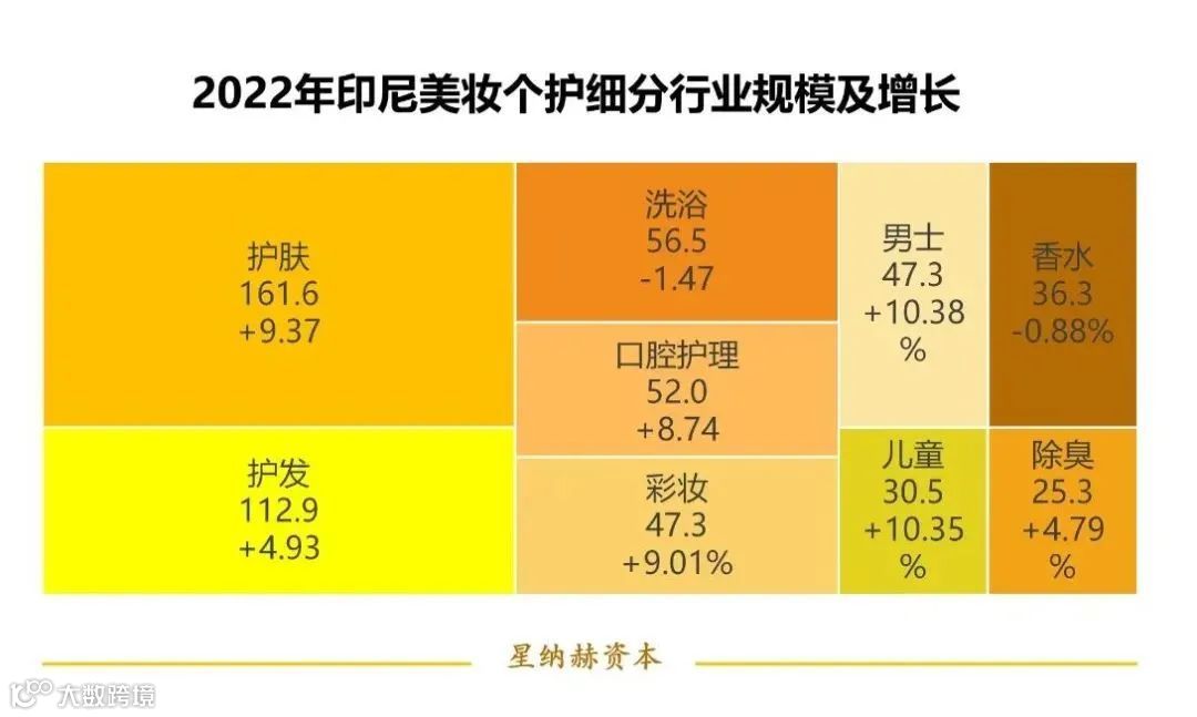 2022年印尼美妆及个护行业总规模达75.4亿美元,过去五年复合增速6.6%。其中护肤是最大细分品类,2022年市场规模23亿美金,年增速9.37%。