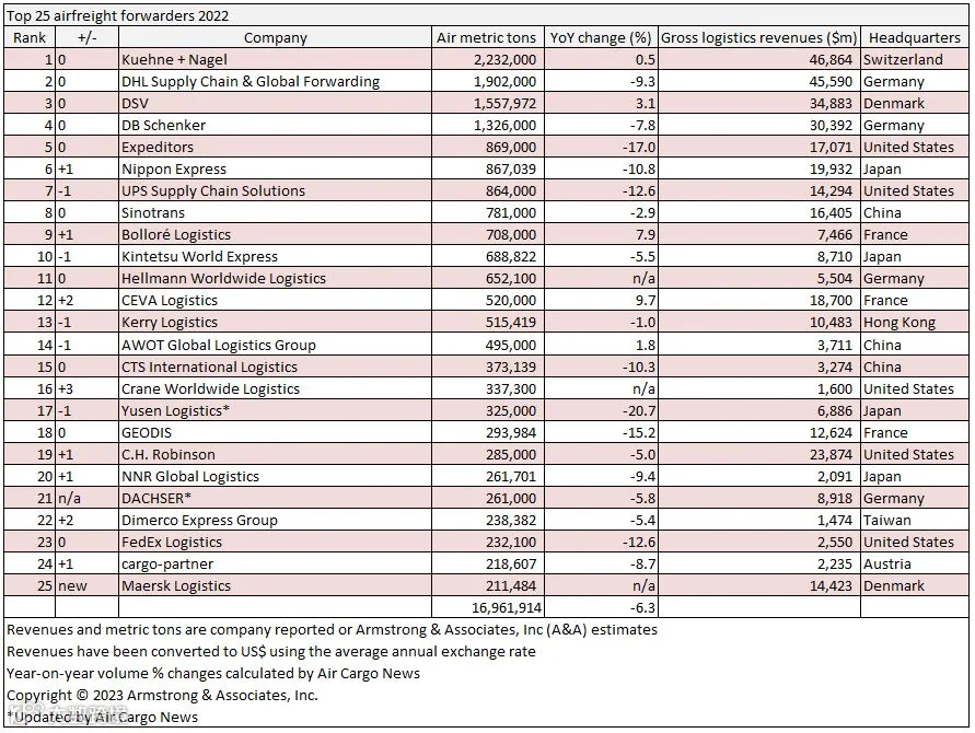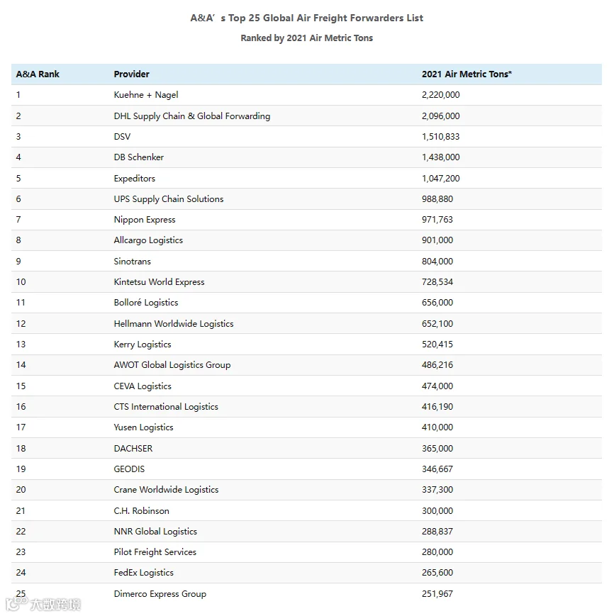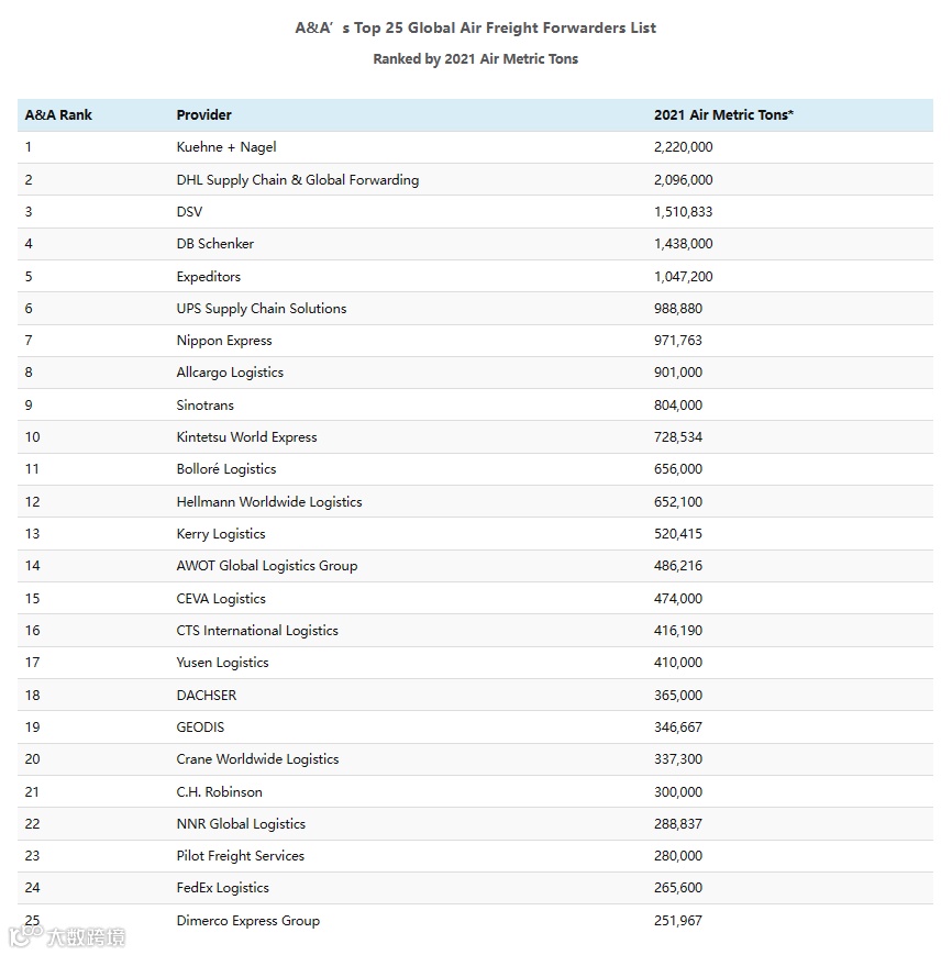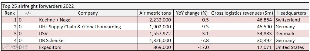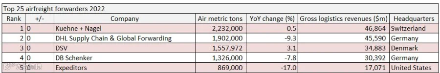 尽管整体前25家公司的需求下降,但领先的空运货代公司德迅却逆势而上,由于在2021年5月收购了Apex Logistics,德迅空运货量有所增长,报告称其运量增长了0.5%,达到创纪录的223万吨。