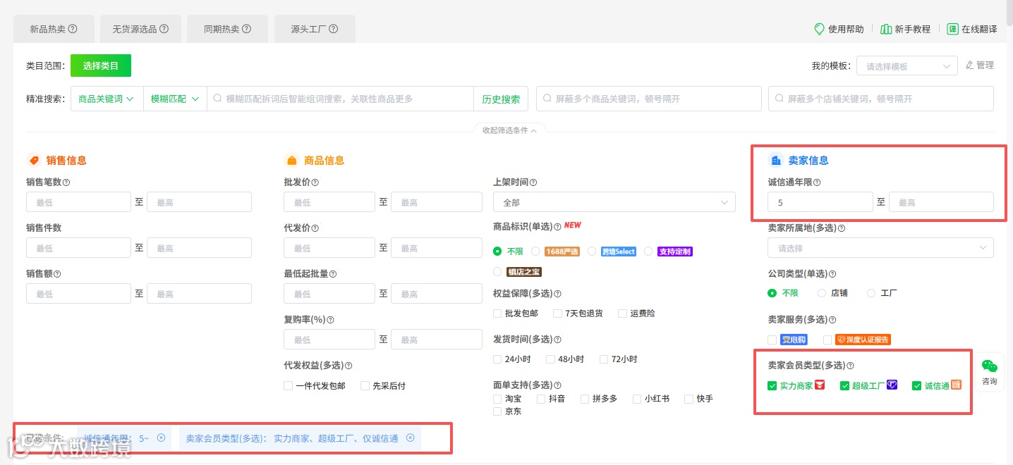 通过1688选品库,进行品类筛选或者输入产品核心词,如耳饰、围巾、帽子等,接着勾选一件代发和面单支持,卖家信息选择实力卖家、超级工厂、诚信通5年以上,这样就能找到找到支持一件代发且综合实力较强的老店。