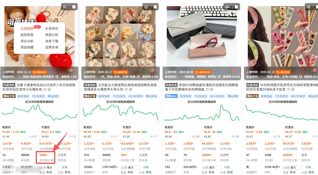 最后根据预算选择货源,除了销售额、批发价等数据,还需要着重看供应商的月代发订单,一般情况下月订单越高,产品下游需求也越高,货源也更加稳定。