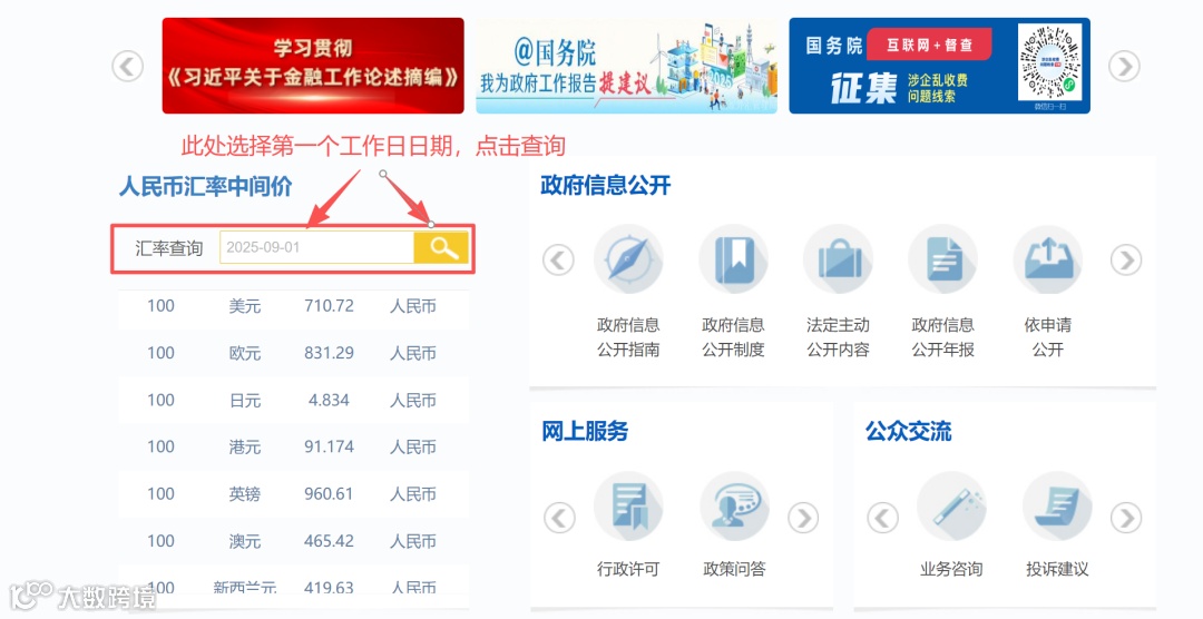查询路径1:进入外管局官网(https://www.safe.gov.cn/)后,通常可在首页或“统计数据”栏目下找到“各种货币对美元折算率表”或“人民币汇率中间价”公告。查找出口月份对应的公告,使用该月第一个工作日的汇率。