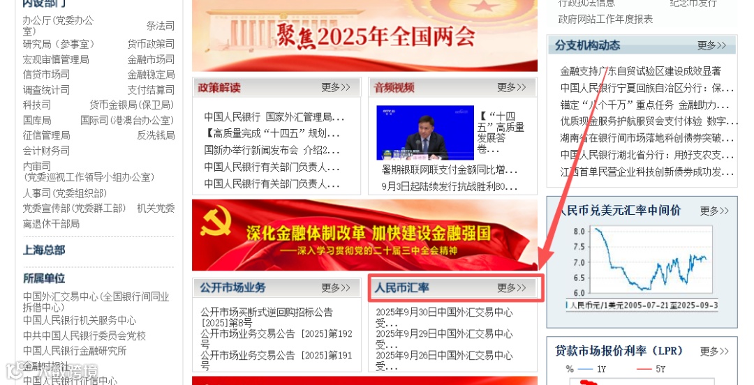 查询路径2(常用):进入中国人民银行官网(http://www.pbc.gov.cn/)后,通常可在首页栏目下找到“人民币汇率点旁边更多”如下图,使用该月第一个工作日汇率。