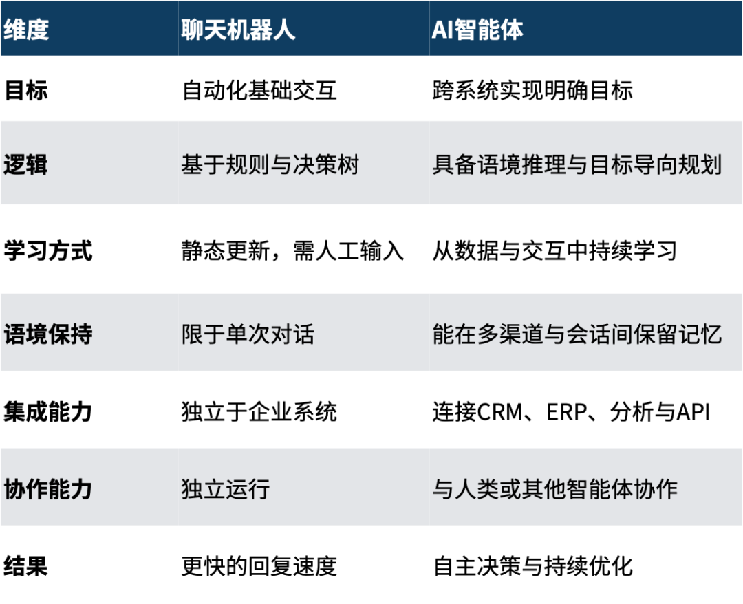 聊天机器人标志着客户服务自动化的第一阶段。它们能处理常规请求、回答可预见问题,并在规模化层面降低人工成本。然而,它们的成功范围有限——依赖关键字与决策树逻辑,无法理解语境或维持跨对话的上下文,仅仅是优化响应速度,而非理解能力。