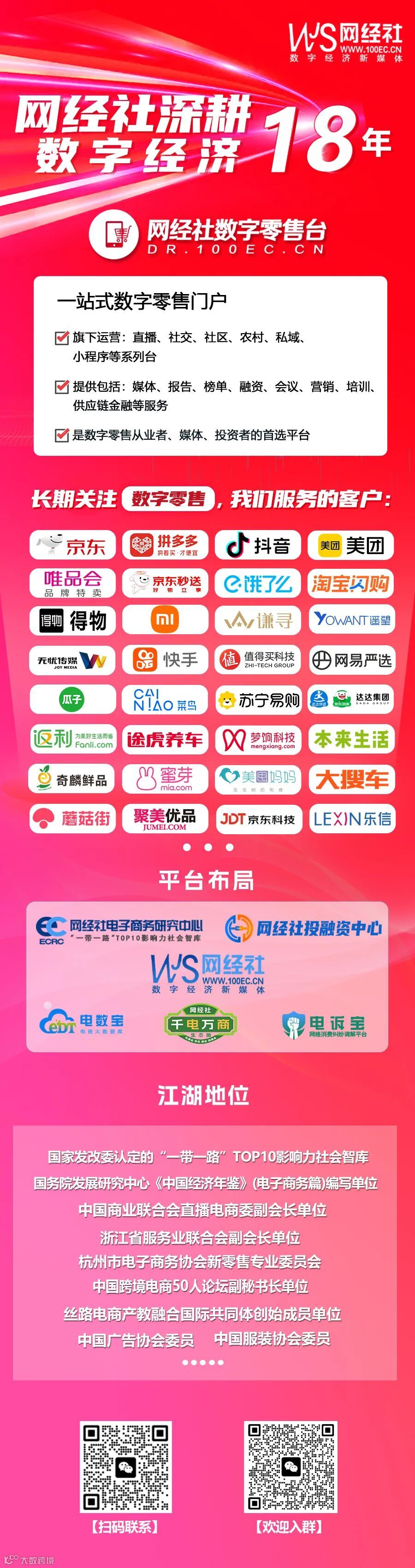 网经社数字零售台是一站式数字零售门户,旗下运营:直播、社交、社区团购、农村、生鲜、汽车、二手、母婴等系列频道,提供包括:媒体、报告榜单、融资、会议、营销、培训、供应链融资等服务,是数字零售从业者、媒体、投资者的首选平台。