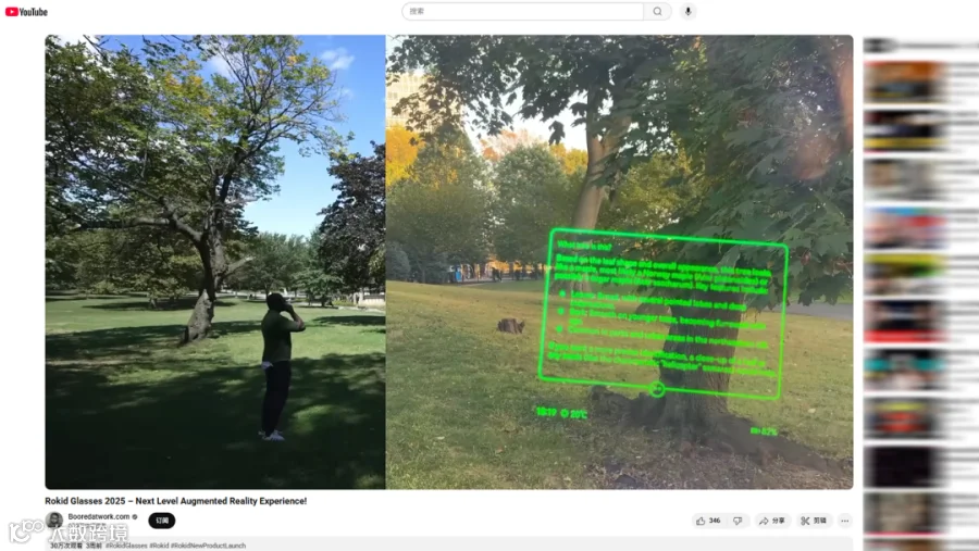 合作视频中BooredAtWork对Rokid AI AR智能眼镜的深度测评,以“可穿戴设备的未来”为主题,全面展示了眼镜的主要功能,包括4K POV摄像、双目显示屏、AI 助手、实时翻译、提词器与导航等,通过实际场景演示,如识别树木、观看外语节目、内容创作等,突出了产品在智能化与实用性上的结合。