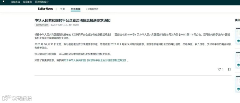 10月13日,亚马逊向卖家发布通知,宣布开始在全站点推送税务合规信息。根据通知内容,亚马逊将在2025年10月31日前向中国 税务机关进行首次季度信息报送,覆盖2025年7月至9月期间的数据。报送内容包括卖家的身份信息、交易数量、收入信息,以及支付给平台的佣金和服务费等。而在此之后,亚马逊将以季度为单位,自动向税务机关推送相关信息。