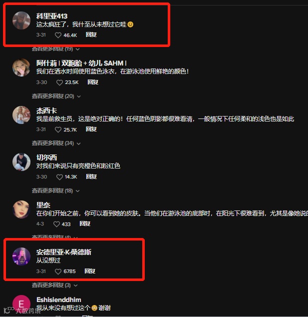 此外,评论区也有不少用户表示,自己在儿童泳衣的颜色选择上都主要考虑红色/粉色/橙色和黄色以及霓虹色,没想到买蓝色泳衣。一位似乎是位儿童泳装品牌的创始人也回复道:由于这个原因,今年已经做了很多儿童霓虹泳衣套装。