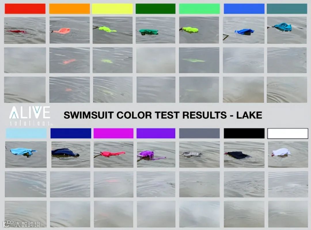 2021 年,水上安全组织 Alive Solutions Inc. 曾在游泳池和湖泊中测试了 14 种不同颜色的泳衣。每次测试,Alive 都会将每种泳衣颜色放在水面上,然后他们将潜水服浸入水中并搅动水,使潜水服下沉约 18 英寸深——这个深度的能见度对于水上事故中的救生至关重要。