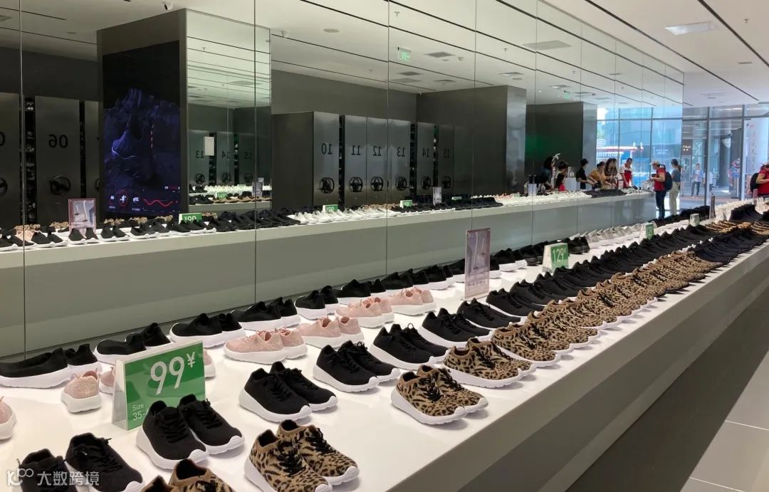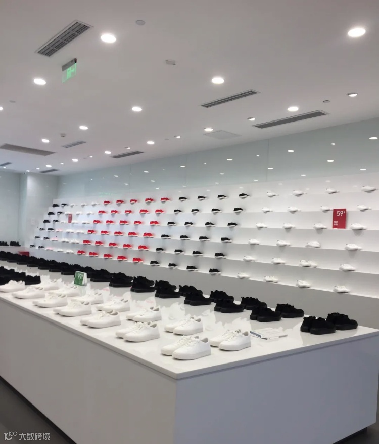 它在北上广深杭等一线城市的商场核心位置开出数百甚至上千平方米的大店,店内仅陈列十余款鞋,采用类似苹果旗舰店的极简装修风格,售价却仅为59元至199元,常推出99元3双的促销活动[1]。