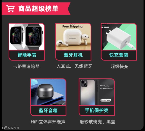 TikTok shop发布的热销榜单中,蓝牙耳机、手机壳、快充套装等配件产品赫然在列。