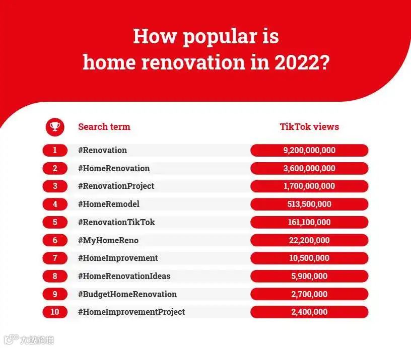 在 TikTok 上,#Renovation 话题热度非常高,至今共累计了高达 92 亿 的浏览量。