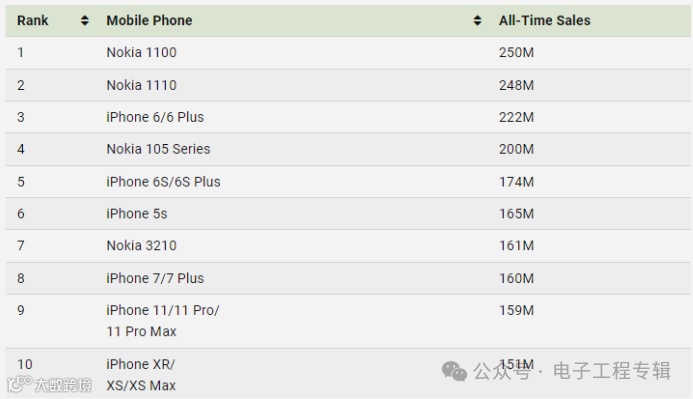 近日,外媒Visual Capitalist综合维基百科、雅虎财经及分析公司Omdia的数据,发布了有史以来销量最高的手机排行榜[k]。引人关注的是,在销量前十机型中,未有一款安卓手机入围,全部由诺基亚和苹果包揽[k]。