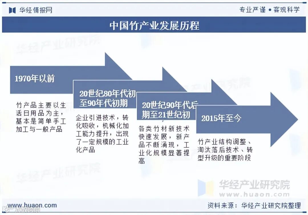 竹是多年生禾本科竹亚科植物,是禾本科的一个分支,是高大、生长迅速的禾草类植物,竹叶呈狭披针形,长7.5~16厘米,宽1~2厘米,茎为木质,有些种类的竹笋可以食用,竹的开花周期长,繁殖器官材料不易获得,其营养体特征易受生长环境影响。中国竹产业为促进社会、经济发展和生态建设做出了重要贡献。纵观行业的发展,主要经历了以下4个阶段: