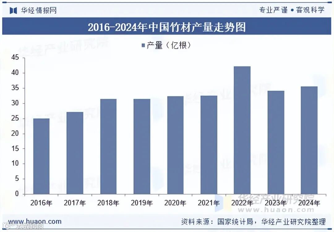 中国竹资源丰富。近年来我国竹资源总体呈增长态势,自2018年以来,竹材年产量基本维持在30亿根以上。截至2023年,我国竹材产量达到34.18亿根,2024年国内竹材产量在35.67亿根左右。