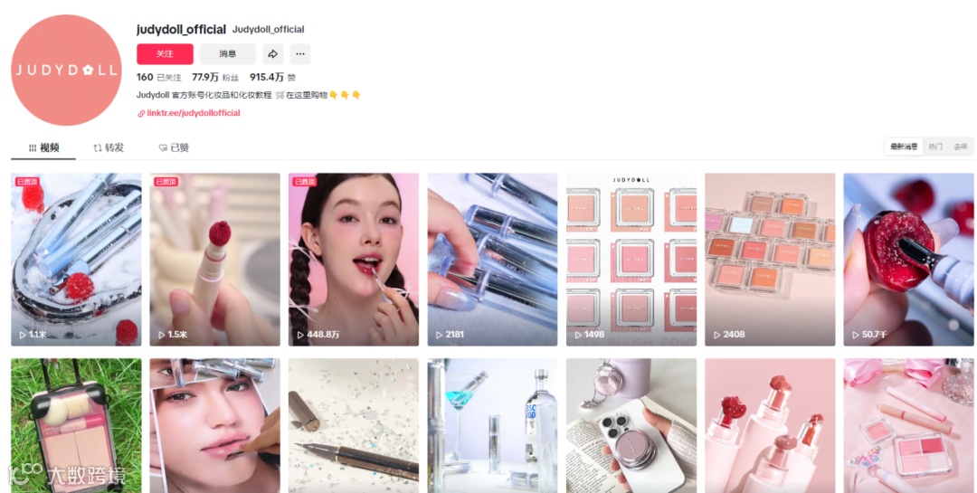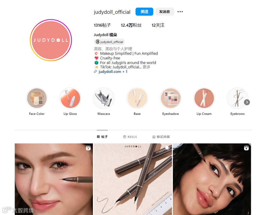 在社媒营销上Judydoll也颇具特色。相比美妆品牌通过铺设多个社媒平台推广矩阵,Judydoll选择将推广投入集中在Ins和TikTok两个平台,分为官方自媒体账号和平台红人推广两种策略。