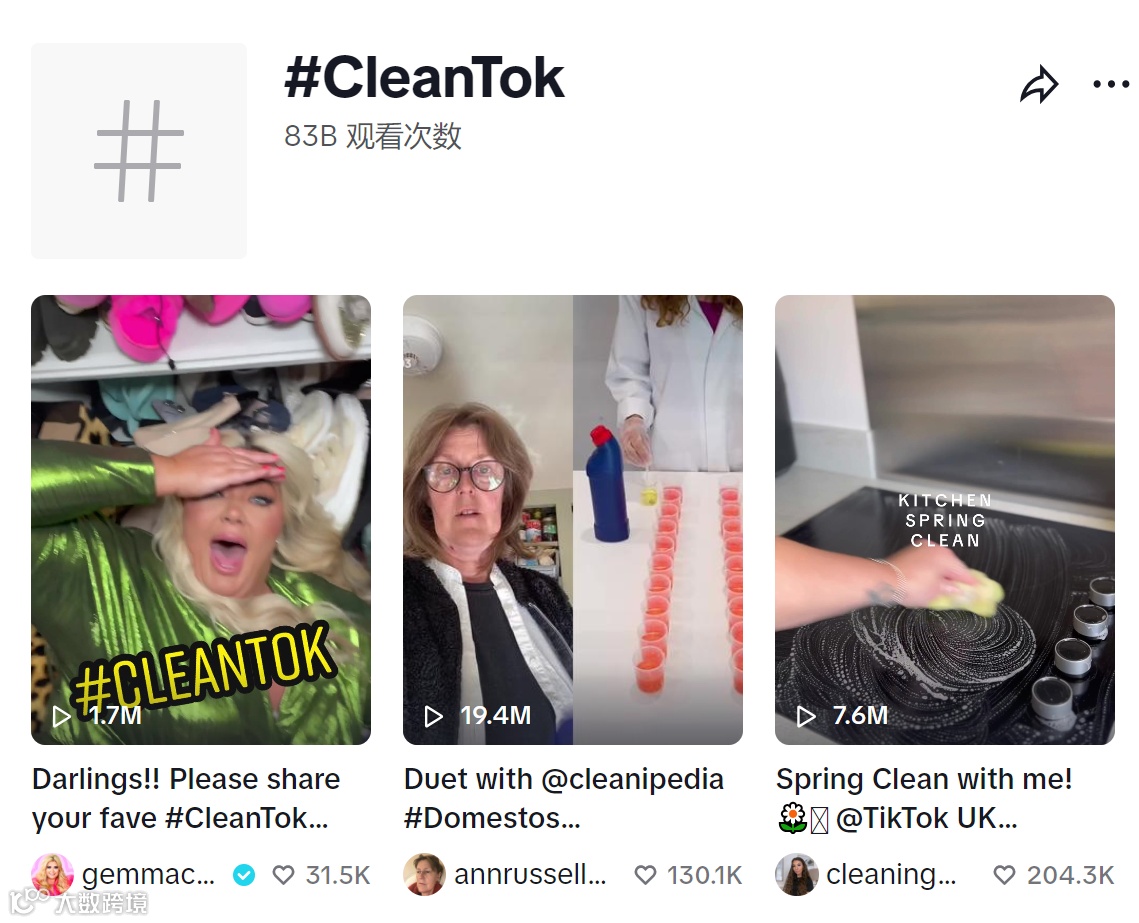 要知道,在TikTok上最为爆火社群#CleanTok(清洁),喜爱观看清洁技巧等内容的人群就在这个标签下积累了八百三十亿次的观看。