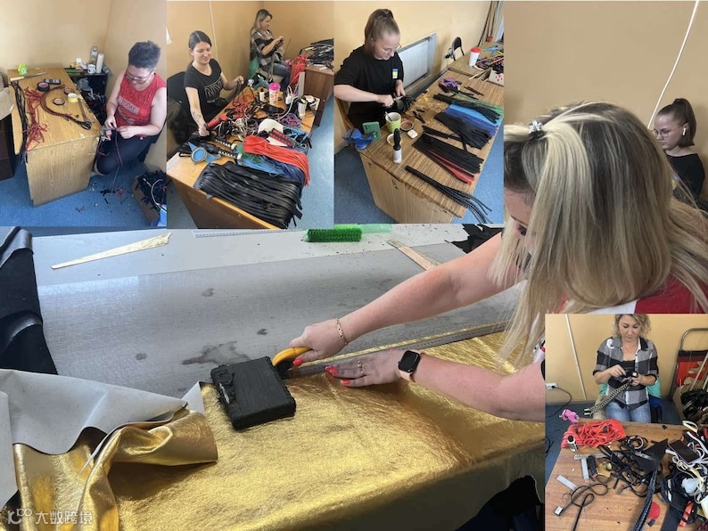 在商品页面中,详细介绍了鞭子采用意大利进口皮革制成,而这款皮鞭套装,包含马鞭、树枝、蛇鞭、鞭子和九号鞭,强调由人工手工制成,并在商品图中展示了原料及制作过程。