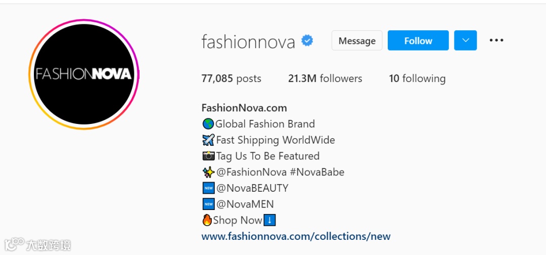 在 Instagram 上,Fashion Nova 拥有超 2100万 的粉丝,且每年几乎 都 以 600% 的速度增粉。