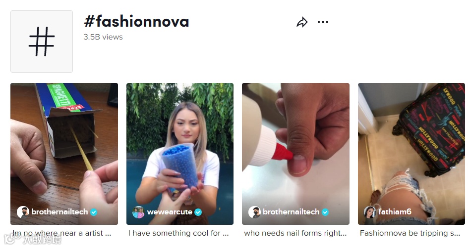 Fashion Nova 在 TikTok 上的内容视频主要以服装挑战,品牌KOL网红、名人及微网红的视频转发为主,而其相关话题 #fashionnova 的曝光量就有 3.5亿次 之多。