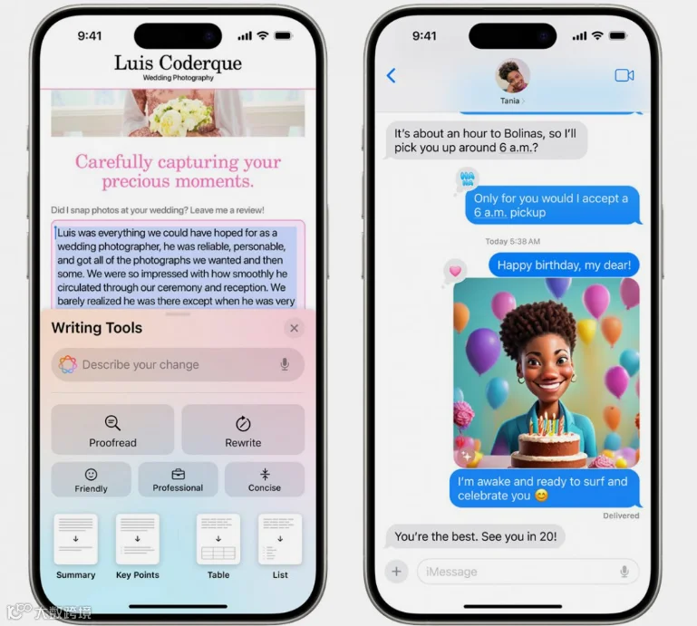得益于全栈生态系统控制权,Apple Intelligence实现了跨应用协同操作,例如识别相册中的好友照片并生成生日贺卡直接发送,或调用驾照照片自动填写表单信息[k]。系统还能基于邮件中的航班信息提醒出行计划,或根据备忘录内容提示用餐安排,展现“行为智能”[k]。