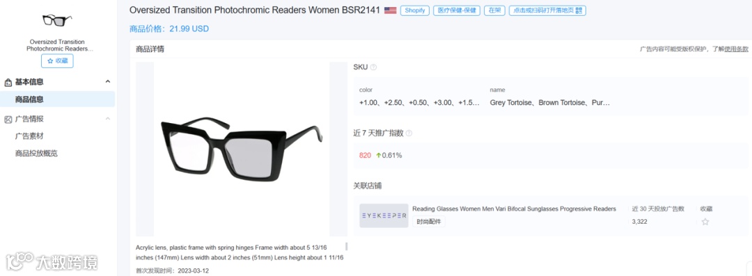 这款产品是 Eyekeeper 推出的主打功能性的阅读眼镜,产品售价为21.99美元,目前在投广告数为91,推广指数达820。该产品是一副超大尺寸的变色阅读眼镜,可以根据光线的强弱自动调节镜片的颜色,适合在室内和室外使用。此外,由于镜框更大,使该产品相较其它款式更具时尚和更具特点。