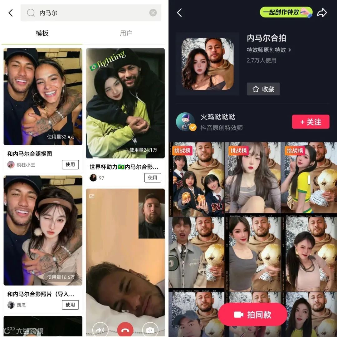 但随着赛事推进,热度逐渐下降。社交平台涌现大量教程,醒图上线模板,抖音推出内马尔合影特效,一键生成削弱了人工P图需求,行业开始内卷[k]。