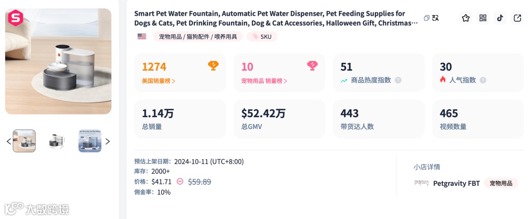 在Tik Tok上,主营宠物用品的卖家去年迎来了自己的商机:一款智能宠物饮水机在10月份上架出售便迅速走红,3天爆卖20万美元,销量大增753.8%。