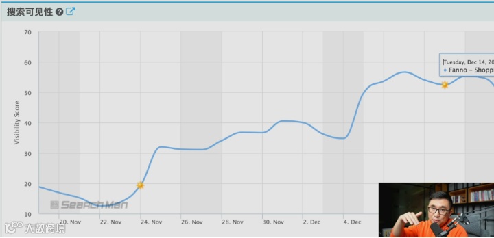 而在一些工具评估APP的“搜索可见性”上可以看到,从12个月开始,整个Fanno的曲线已经开始往上涨了,虽然有一部分原因可能是很多中国卖家去下载安装了解这个平台,不过总体来说趋势确实还是可以的。但由于Fanno目前排名流量还刚刚起步,仍需要大量投入和推广。