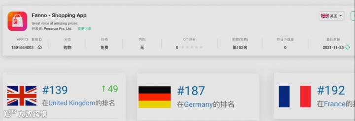 首先最主要的就是流量。流量对于电商而言非常重要,很多时候它可以通过应用市场去获得自然流量跟竞价流量,通过一些第三方软件可以看到,目前Fanno在海外的数据体现——英国下载排名在139,德国187,法国192,西班牙暂无数据。所以这个是目前我们能看到它在 APP端的一个大概排名情况,就购物类目来说其实排名还是比较靠后的。