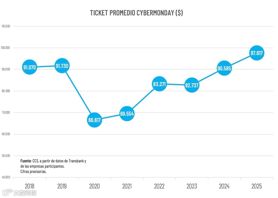 2025 年 Cyber Monday 期间,客单价攀升至 97,617 智利比索(约 102 美元),不仅创下历史新高,更实现 7.76% 的同比增长。值得关注的是,鉴于 2025 年该大促完全在 10 月举办,与 2024 年首日处于 9 月的时间节点形成差异;同期周一至周三的产品发货数量和网站流量也表现强劲,较平日翻了两番,尽显大促消费热度。