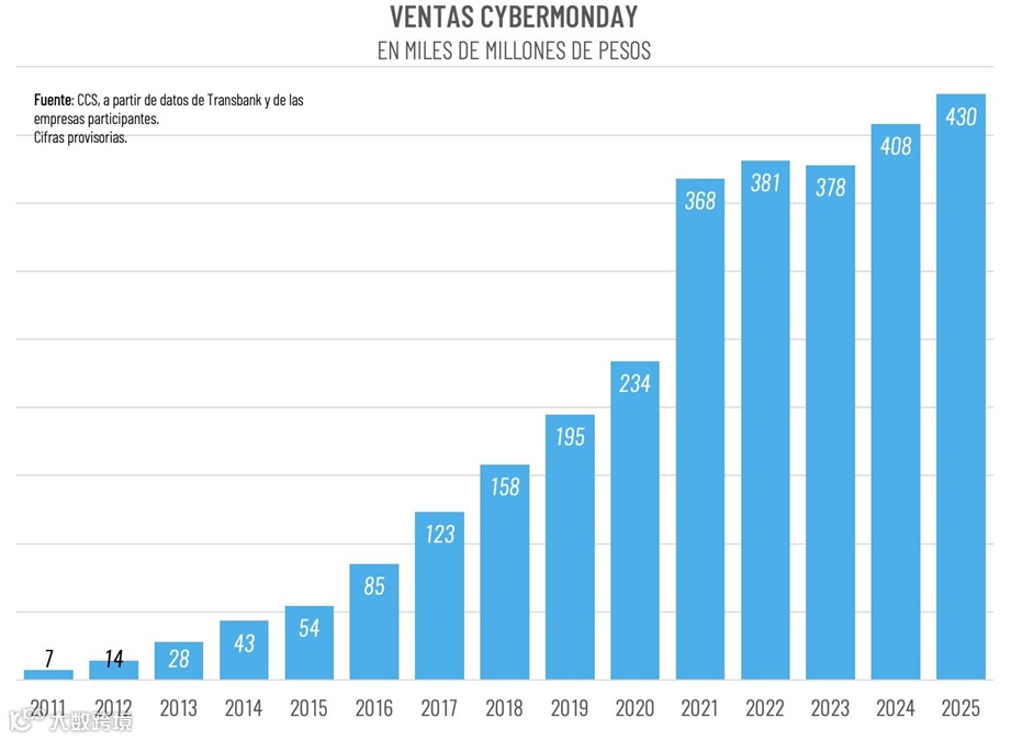2025 年 10 月 6 日至 8 日,智利 Cyber Monday 大促圆满落幕。据圣地亚哥商会(CCS)披露的数据,这场为期三天的电商盛宴以总交易额 4.5 亿美元(4300亿 CLP $)、440 万笔交易(销售了超过1000万件产品)的成绩,较 2024 年活动相比名义增长了 5%,是自 2011 年创建以来的最高销售额水平。
