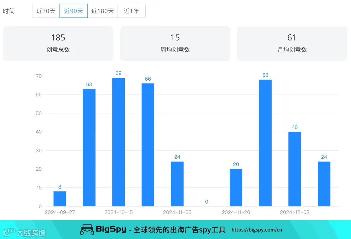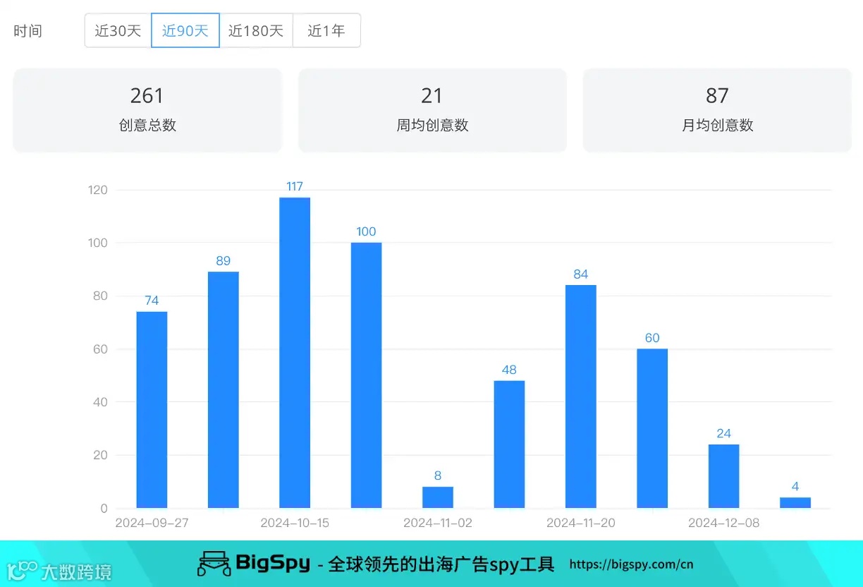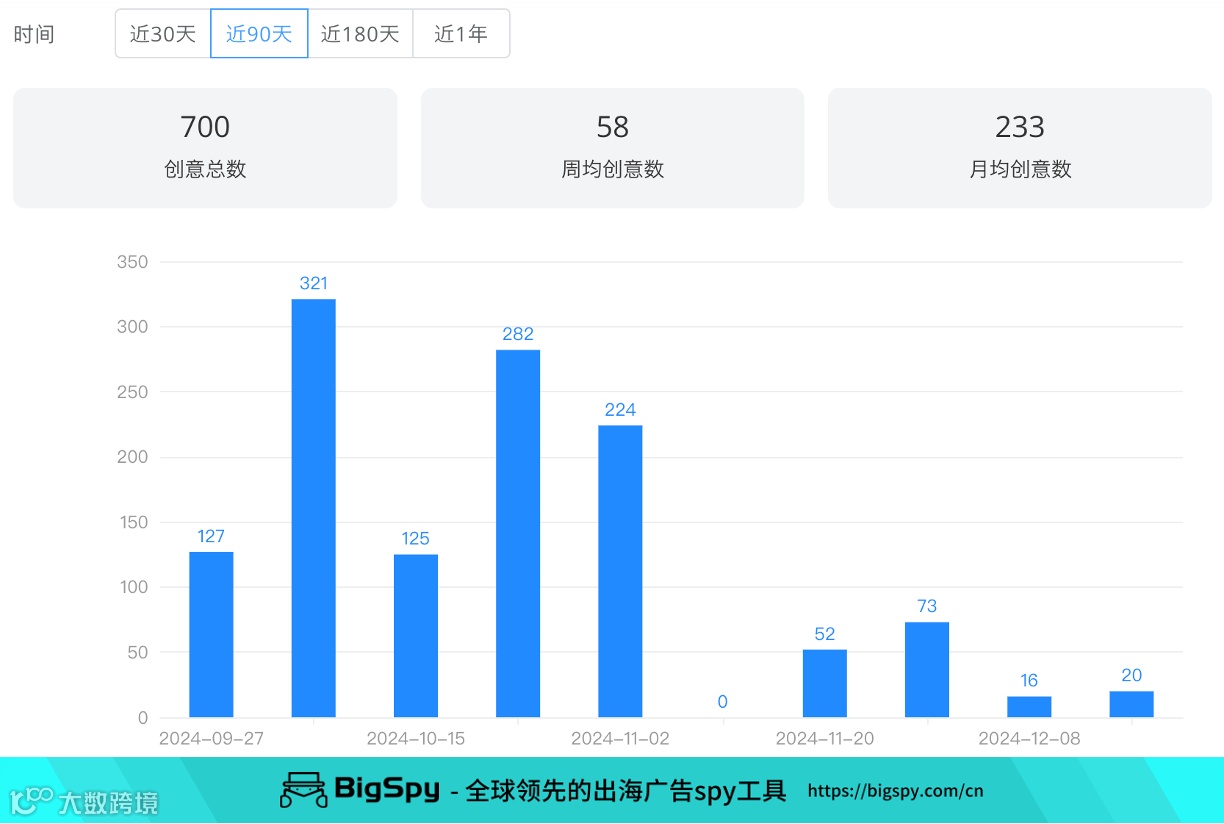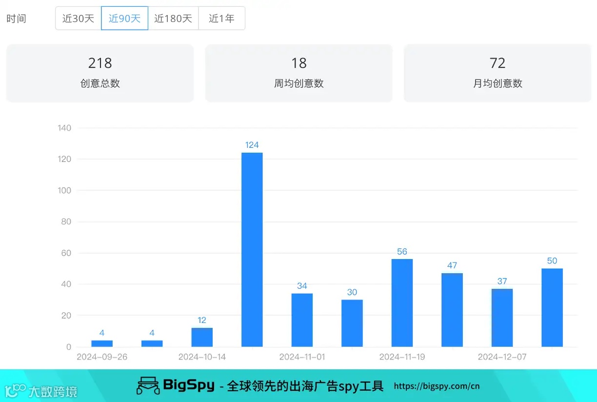 品牌主要目标市场是瑞士、法国、德国和加拿大,近3个月,其Facebook广告周均创意数近20,投放高峰在10月下旬;