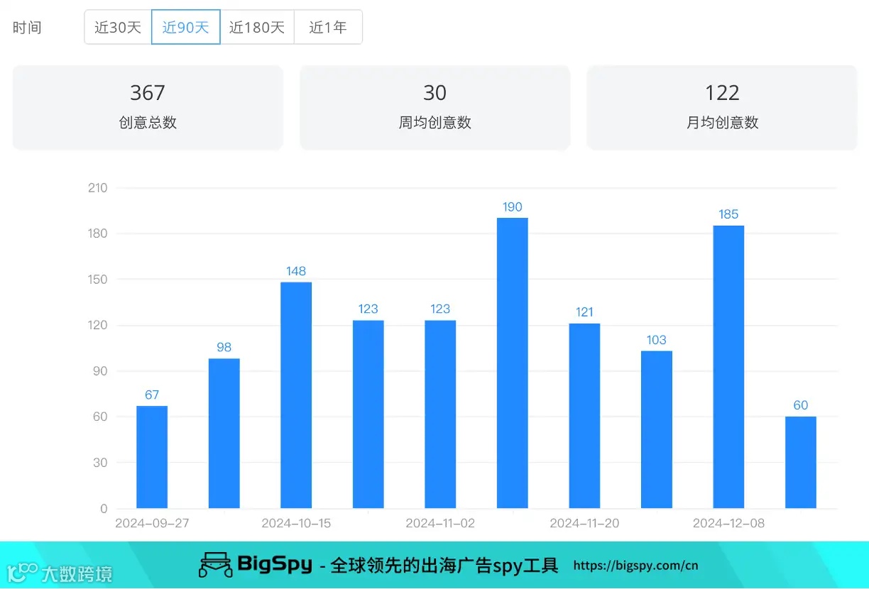 品牌主要目标市场是法国、英国、加拿大和德国;近3个月,其Facebook广告周均创意数约15,两个小投放高峰在10月中下旬和12月初。