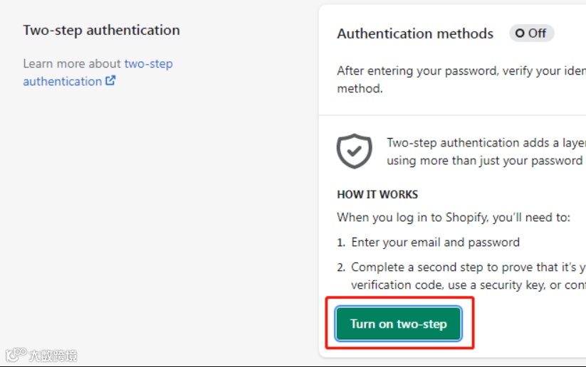 建议没有设置Shopify两步验证,可以设置一下。当您本人以外的任何人尝试使用您的账户登录您的Shopify 后台时,两步验证可提供额外的安全性。