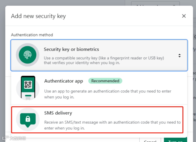 5.这里有三种验证办法,我们选择SMS delivery,SMS delivery是通过手机验证码登录网站。当然,也可以选择其他的验证办法。