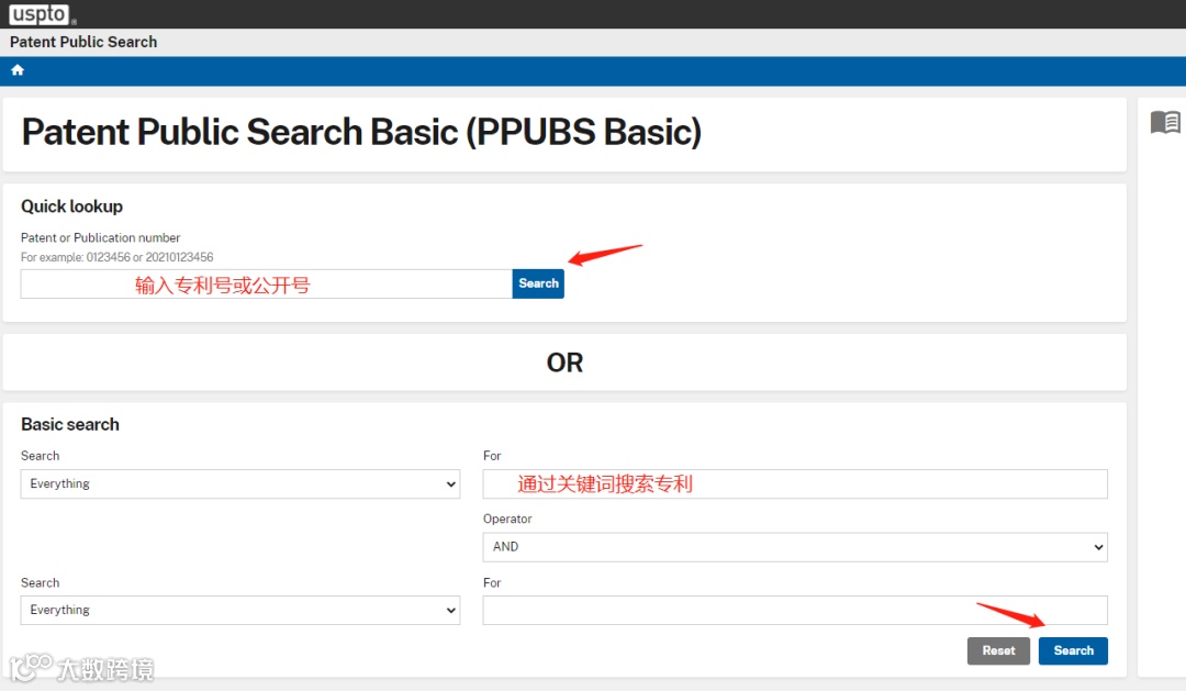 3、两种查询方式,可以在“Quick lookup”框内输入专利号或公开号,然后点击“search”进入详情页面;