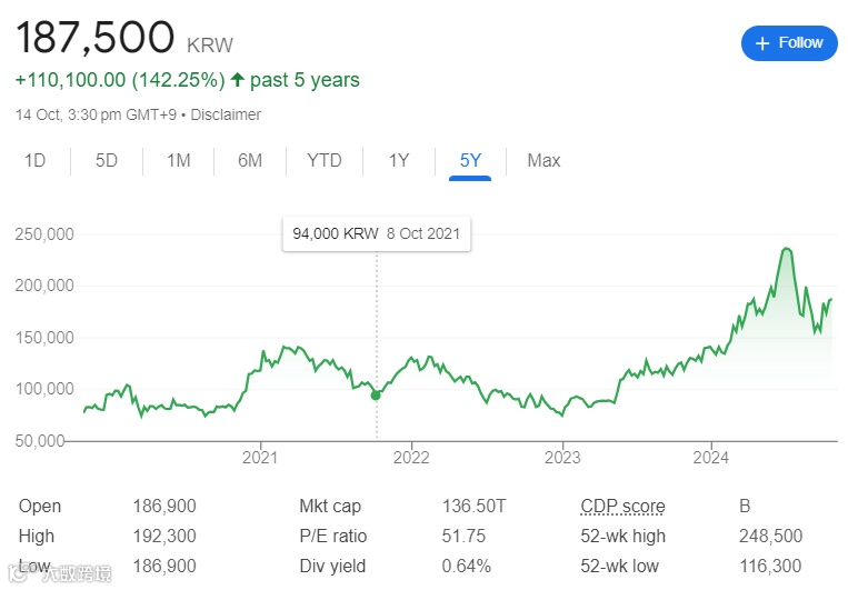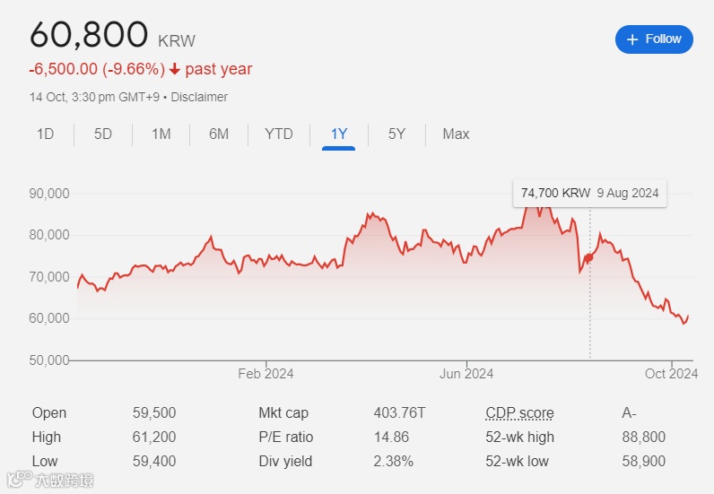 在此期间,公司股价从7.44万韩元大幅下挫20.3%,最低触及6万韩元以下;市值由444万亿韩元缩水至354万亿韩元,蒸发近90万亿韩元(约4699.24亿元人民币),为2004年以来最大降幅[k]。