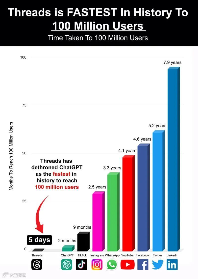 Meta推出的社交app Threads于2023年7月5日正式上线,上线仅5天,注册用户就突破了1亿,用户增速打破了ChatGPT两个月破亿的记录。