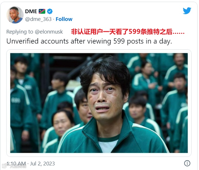 7月2日,马斯克公布了Twitter临时限流政策,规定非认证用户每天只能查看600条推特,新注册的非认证用户每天只能查看300条推文,而已经认证的用户每天能查看6000条。