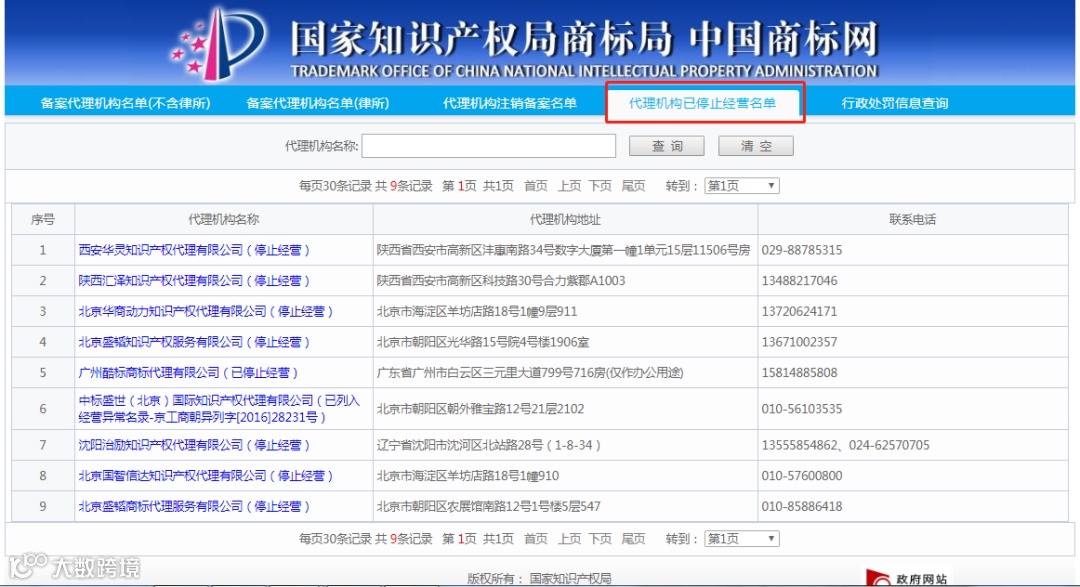 附:商标代理机构停止经营名单(部分):