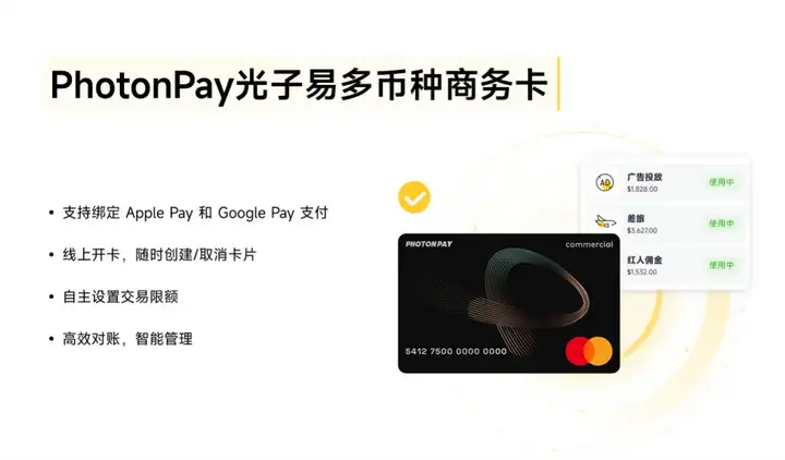 PhotonPay光子易多币种商务卡,支持实体卡、虚拟卡等不同卡片类型的多币种付款,进一步促进线上线下消费场景的融合。
