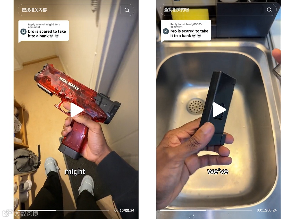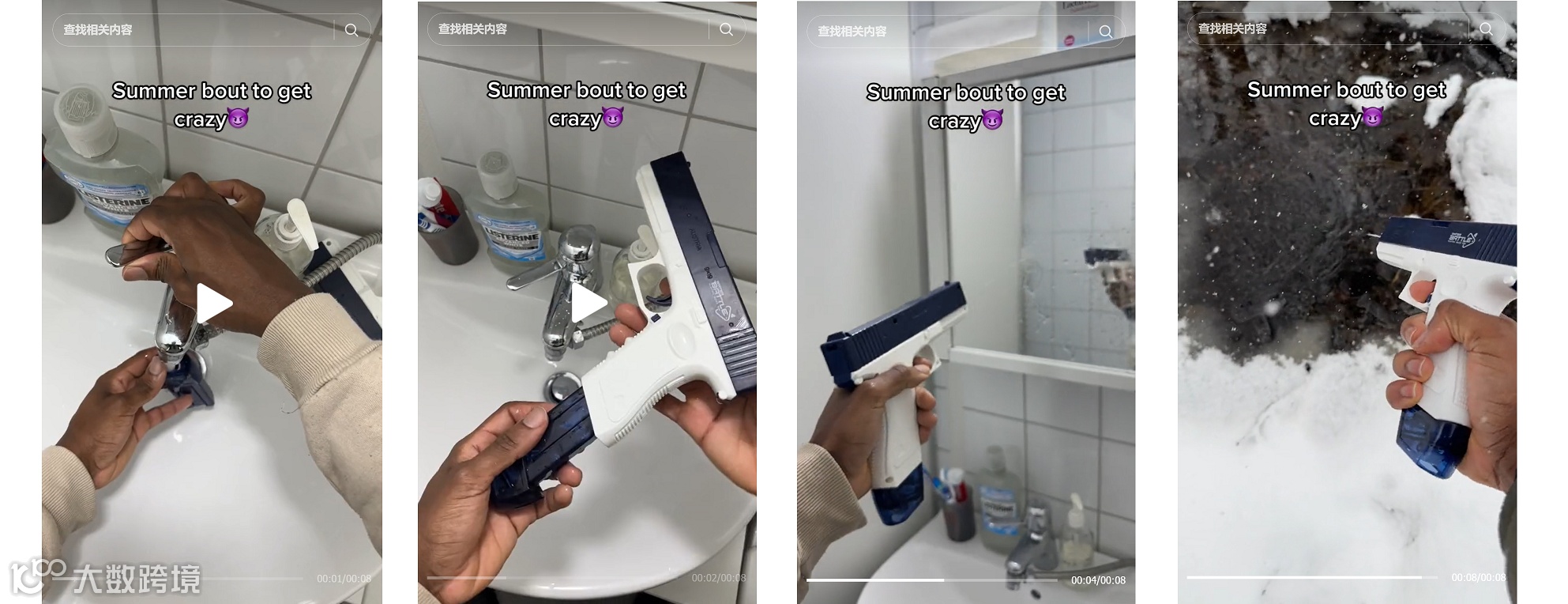 在搜索和分析了TikTok上同类产品火爆视频后,麦琪模仿拍摄了一则创意和结构完全相同的视频。这个产品在TK上表现最好的视频创意很简单,无非是装水,射向镜子,耍帅转枪,再射向其他物体。