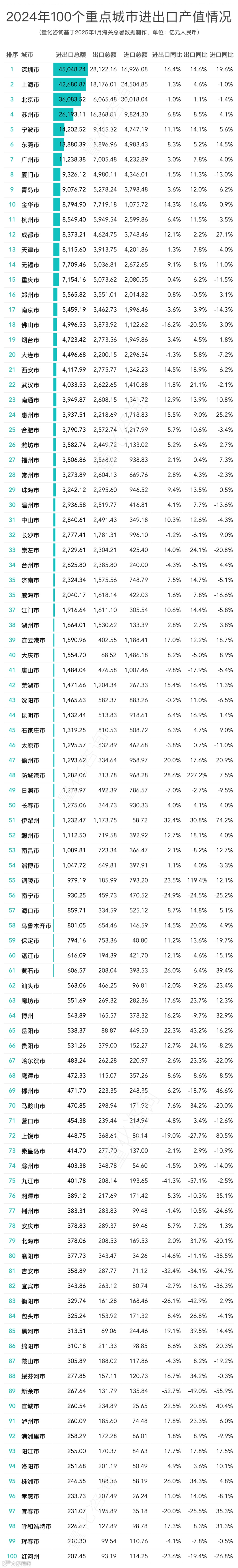 前10名里,排名第6的东莞,出口、进口两项均位列第5;广州在进出口总额、出口两项中均排名第7,进口位列第8;排名第8的厦门进口强于出口,出口排名第13,而进口排名第7;青岛较为均衡;金华则与厦门相反,出口比较强,排名第6,进口则排名第20。具体榜单如下:
