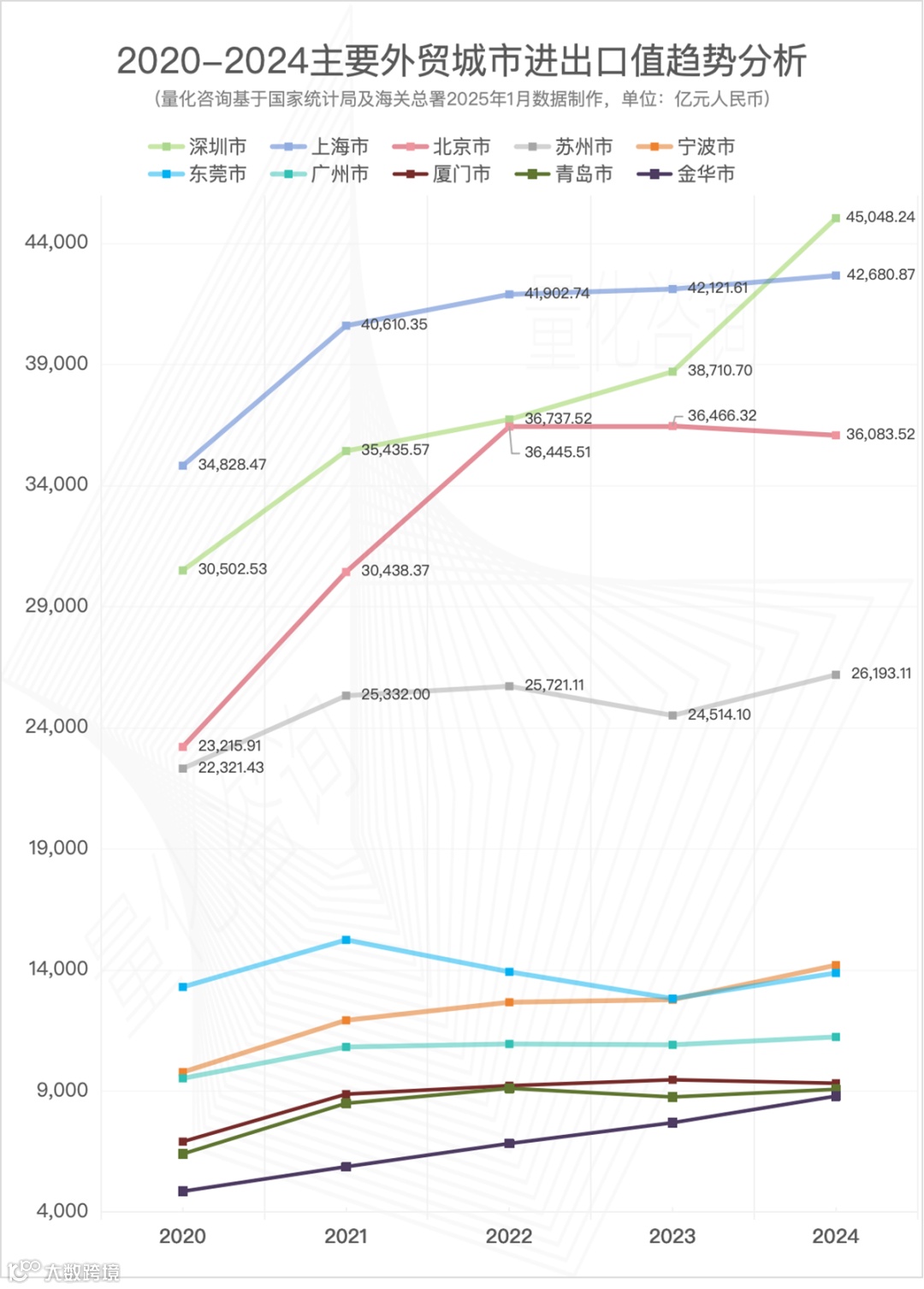 量化咨询也对主要外贸城市前10的城市,深圳、上海、北京、苏州、宁波、东莞、广州、厦门、青岛、金华单独进行了2020-2024年走势图表绘制,以期更清晰的看到前10强城市的变化趋势。可以看出,深圳近5年上升的趋势明显,增长的速度比较快;上海也是一直在增涨的,幅度相对没有这么大;北京在2022年比2021年增长了19.73%,这个增长是非常让人惊喜的,具体走势如下图:
