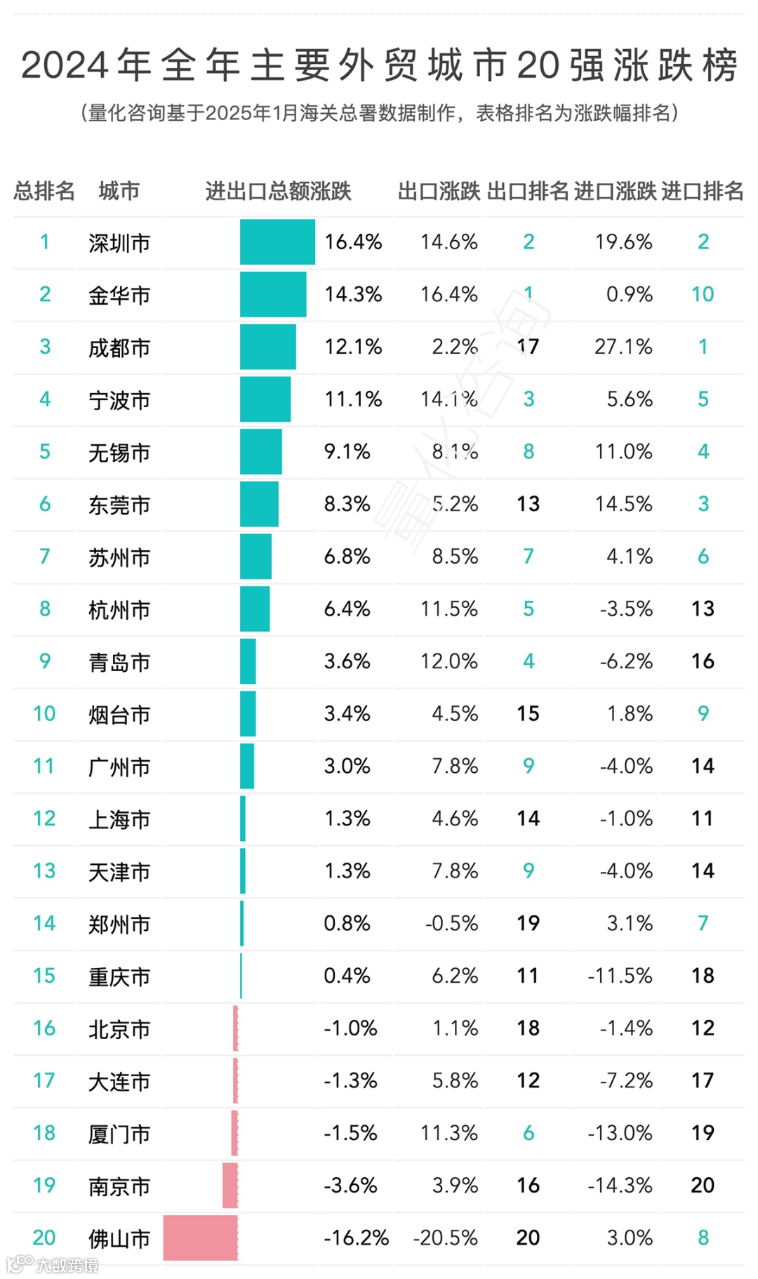 量化咨询对2024年全年进出口总值排名前20名的主要外贸城市进行了同比涨跌幅的排序。从数据上看,排名前20城市中,有15个城市呈上升趋势,有5个城市处于下降趋势;其中深圳、金华、成都、宁波、无锡涨幅居前5,分别增长为:16.4%、14.3%、12.1%、11.1%、9.1%。总额前20位中,跌幅前5的城市为佛山、南京、厦门、大连、北京分别为:-16.2%、-3.6%、-1.5%、-1.3%、-1.0%,具体数据排名如下: