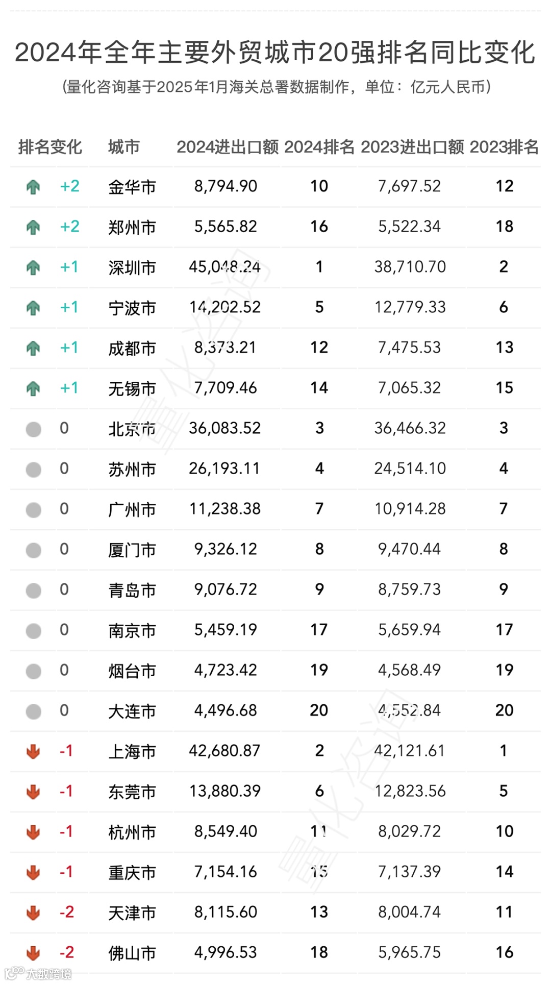 量化咨询对2024年全年进出口总值排名前20的主要外贸城市,与2023年做排名对比,并根据排名涨幅进行排序。涨幅前进2位的有金华和郑州,金华排名从第12升到第10,郑州从第18升到第16;涨幅前进1位的有4个城市,分别为深圳、宁波、成都、无锡。与之相反的是,跌幅居前2的为佛山和天津,佛山从第16降至第18,天津从第11降至第13;跌幅下降1位的也有4个城市,分别为重庆、杭州、东莞、上海。北京、苏州、广州、厦门、青岛、南京、烟台、大连排名保持不变。具体排名情况如下: