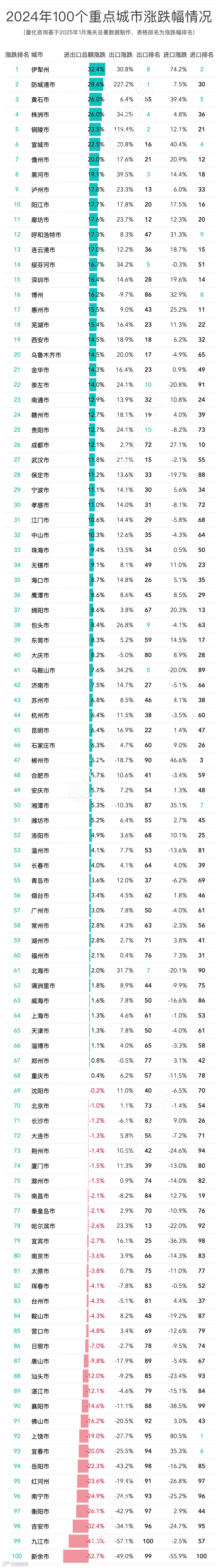 量化咨询对全年进出口总值排名前100的主要外贸城市进行了同比涨跌幅的排序。数据上看,排名前100的城市中,有68个城市呈上升趋势,有32个城市处于下降趋势;其中伊犁州、防城港、黄石、株洲、铜陵涨幅居前5,分别增长为:32.4%,28.6%,26.0%,26.0%,23.5%。总额前100位中,跌幅前5的城市为新余、九江、吉安、衡阳、南宁分别为:-52.7%、-41.3%、-32.4%、-26.1%、-24.9%,具体数据排名如下: