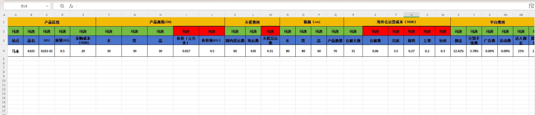 咱们这个表格是分成两个部分的,红色的部分大家不要去动,我们需要更改的就只有绿色的部分,需要你自己填写的有这个广告费,达人佣金,利润,成本,重量,国内运费,贴单费这些,有些成本的问题方面是跟虾皮差不多的,大家也可以看看我之前发布的那篇关于跨境定价成本的文章,根据自己的实际情况来调整,如果是免运的话,咱们就不需要自己去填写。