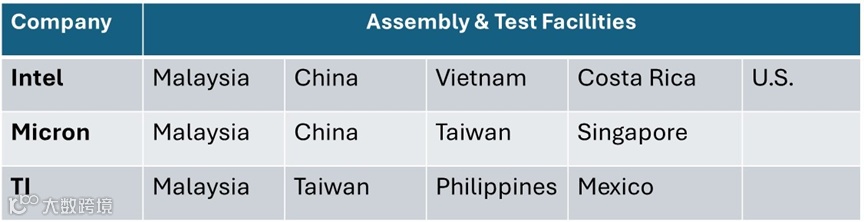 上述四地在美国进口中占比较高,主要因其在全球半导体封装与测试(A&T)环节占据主导地位。尽管除中国台湾外,这些地区缺乏大型晶圆厂,但集中了全球约70%的A&T设施,涵盖IDM厂商自有产线及外包封装测试(OSAT)企业[k]。
