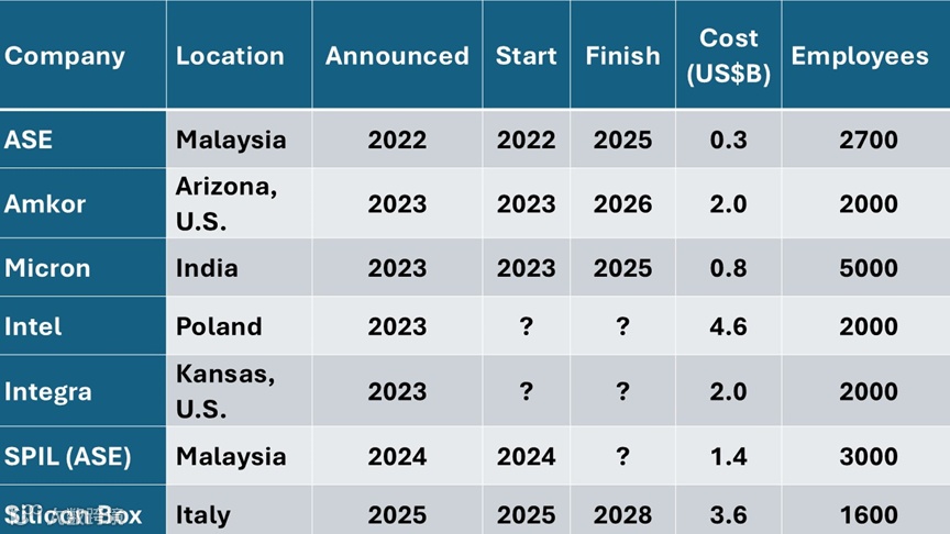 目前仅有少数A&T项目落地美国:OSAT企业Amkor正建设工厂以支持台积电亚利桑那晶圆厂;Integra Technologies计划在堪萨斯州建厂,但已推迟。相比之下,英特尔位于波兰的A&T项目亦推迟至少两年[k]。
